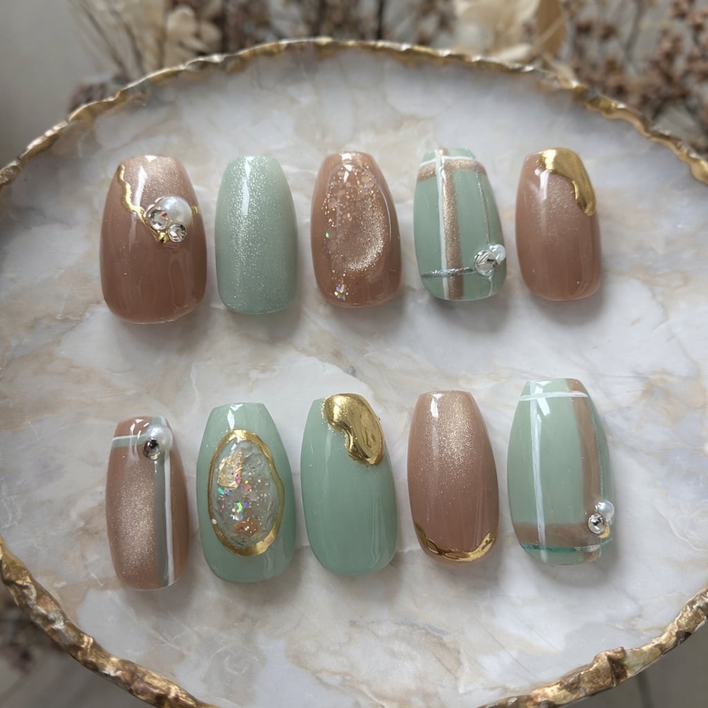 サイズオーダー!くすみ系×マグネット×グリーン×ブラウンネイルチップ