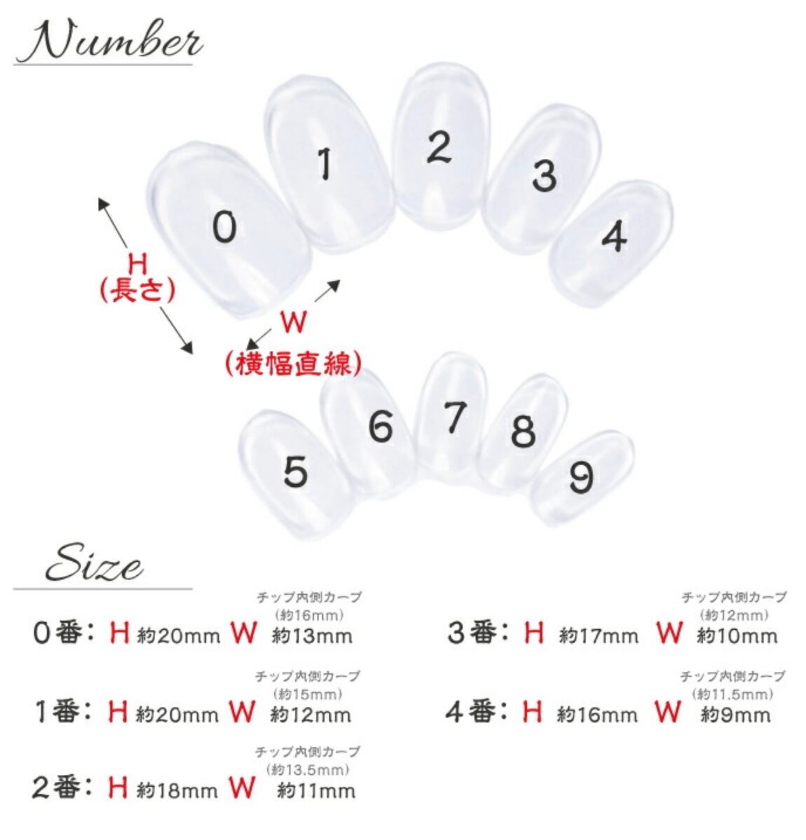 購入希望のお客様は、ネイルチップを購入の前に、計測用のネイルチップの購入をおすすめしております。オプションに計測用のチップが販売しておりますので、そちらからお好きなチップの形をお選びいただき、ご自身で何番のチップが合うのか確かめていただきたく思います。計測用チップを購入しない場合、チップのサイズがお決まりでしたら、オーダーにて親指から小指まで順番に番号を教えていただく形になります。例を参考によろしくお願いします!
