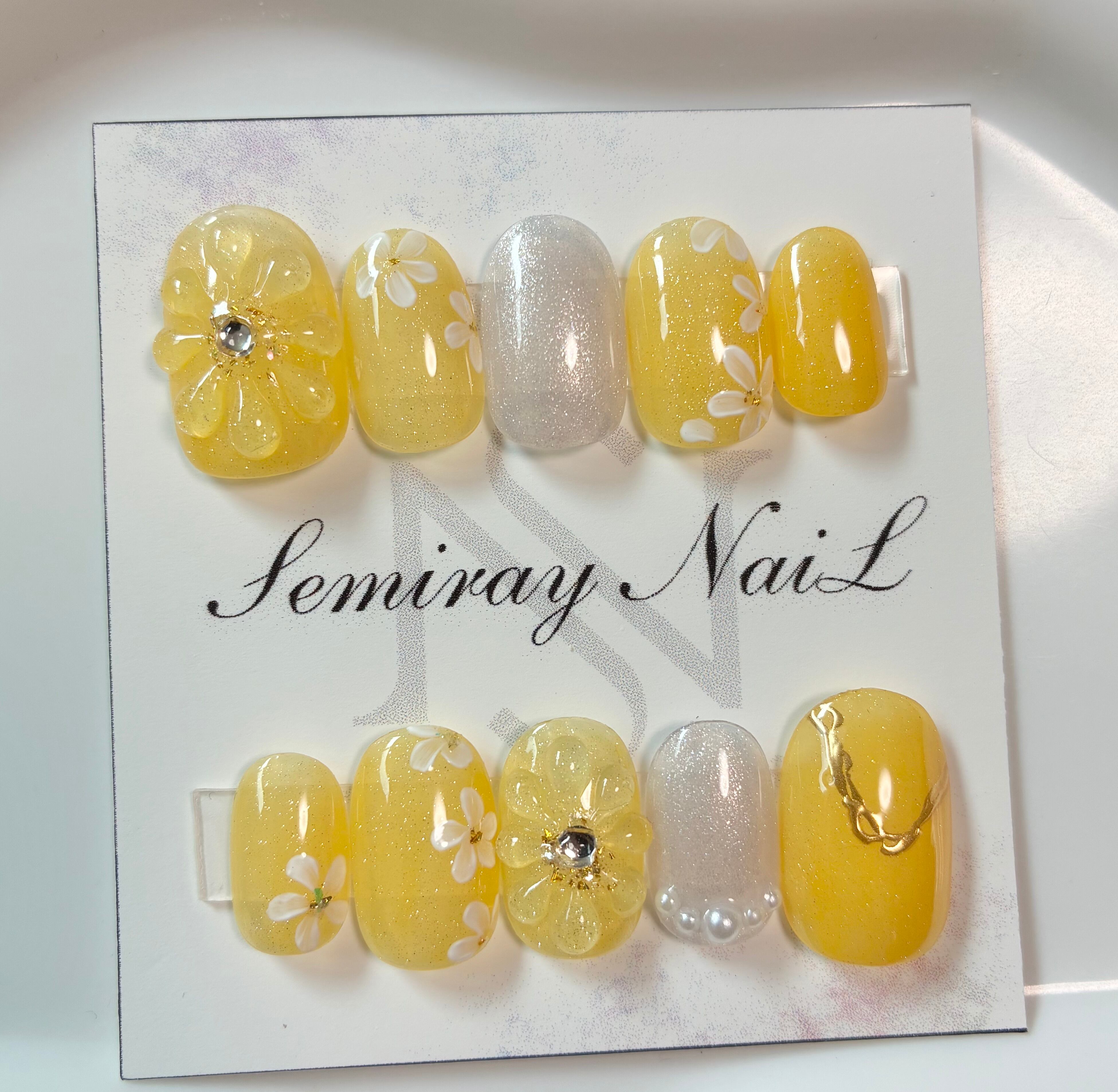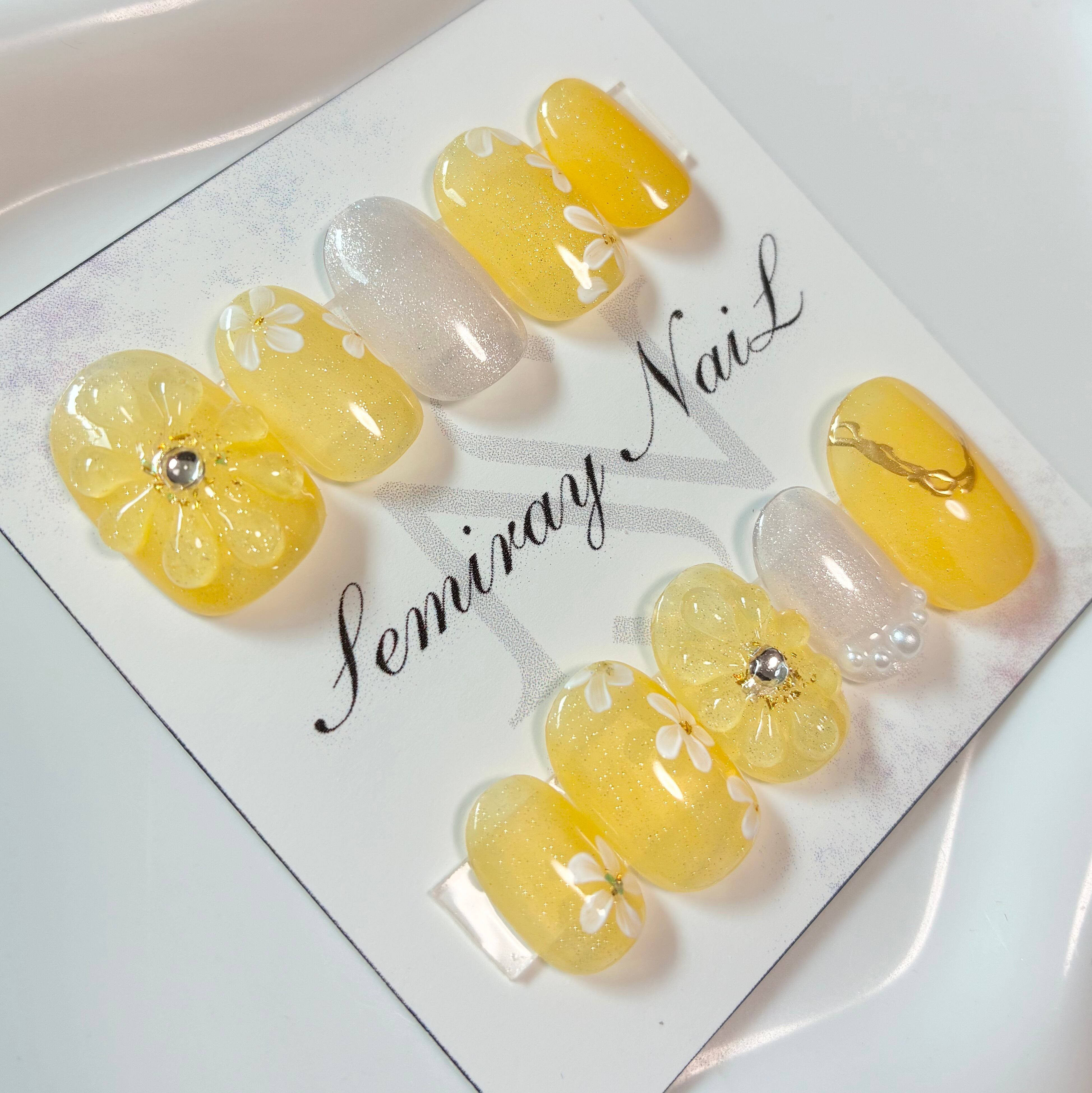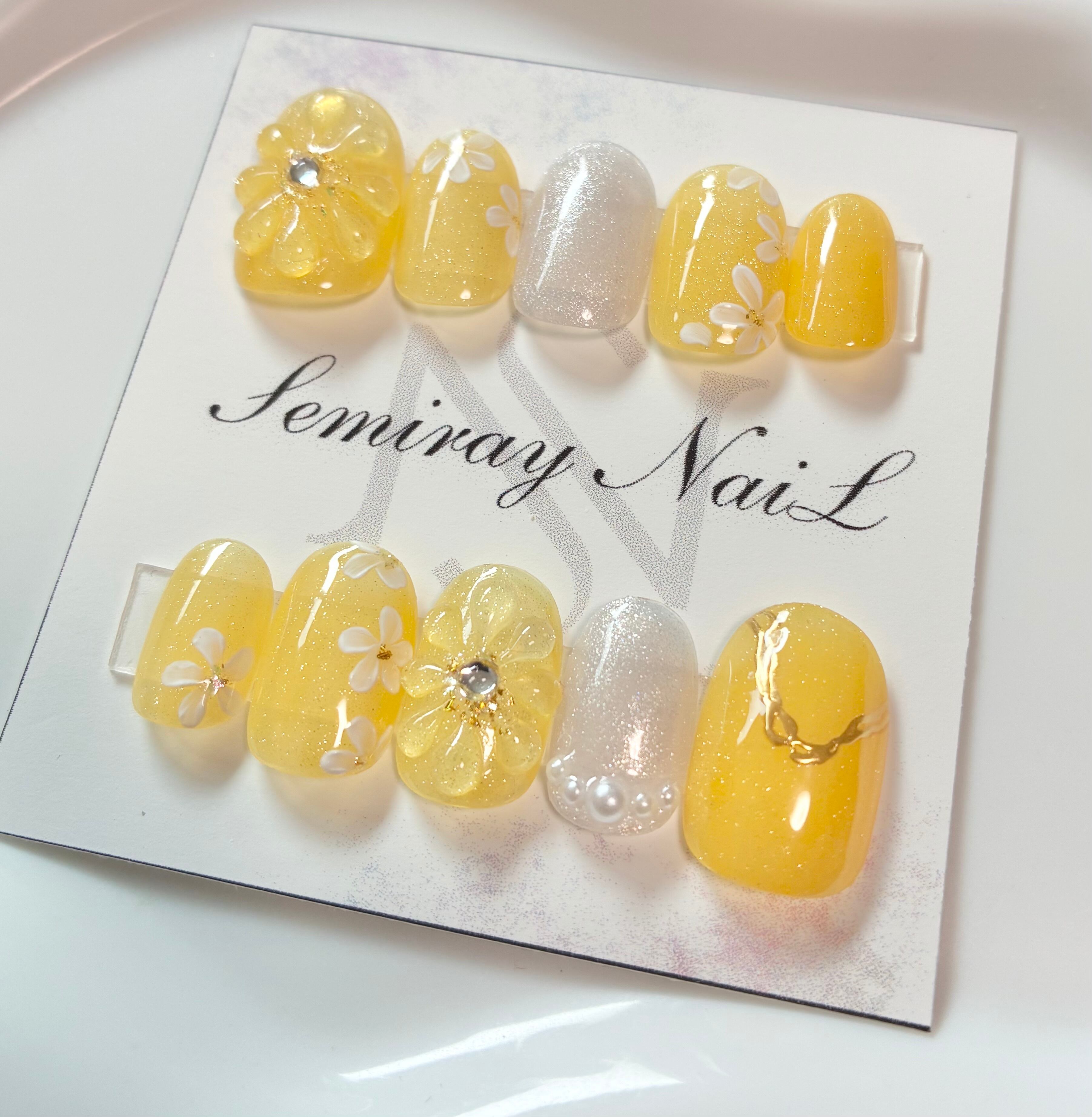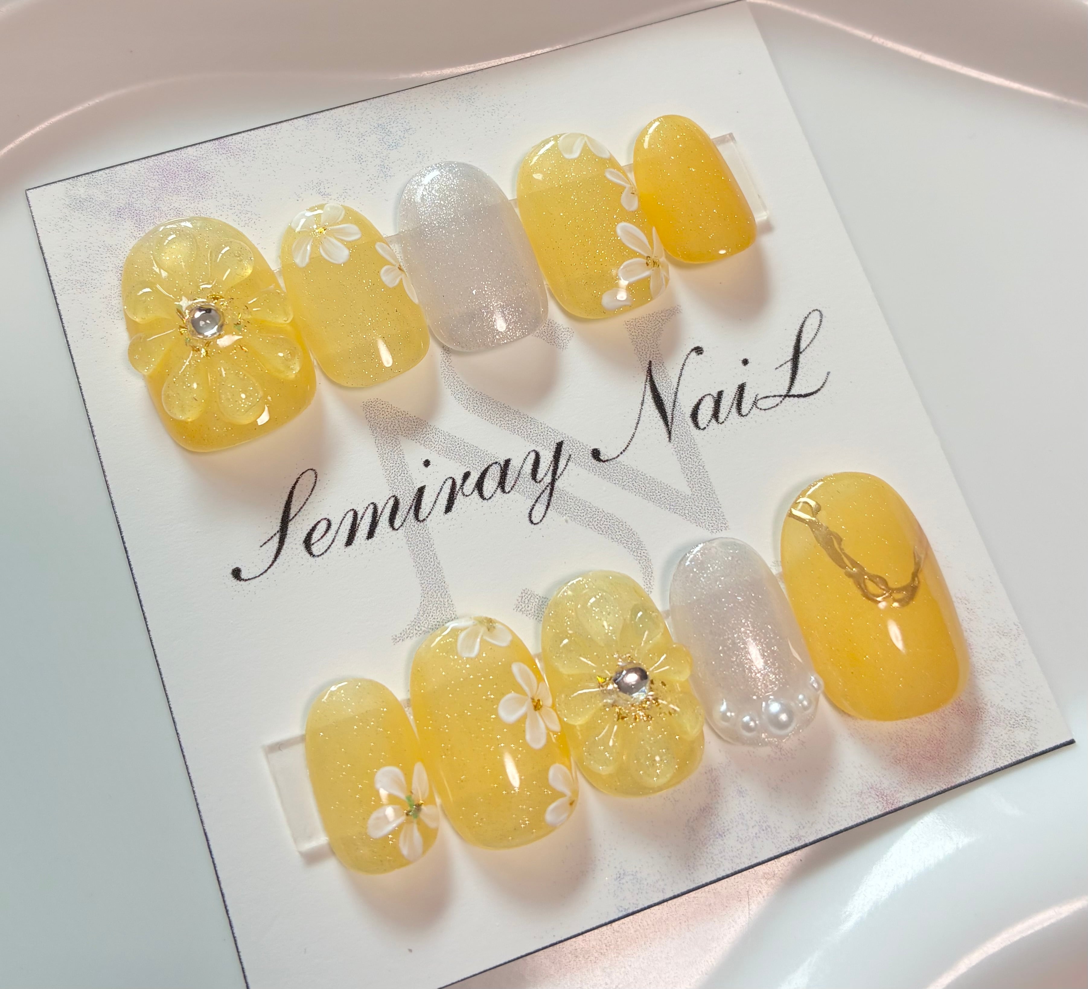 明るく弾けるサマーイエローにぷっくりとした花のデザインが施された、夏にぴったりのアイテムです。華やかなフラワーモチーフが指先に生命感を与え、どんなシーンでもあなたの魅力を引き立てます。サイズオーダーが可能なので、あなたの爪にきっちりとフィットするネイルチップをお楽しみいただけます!