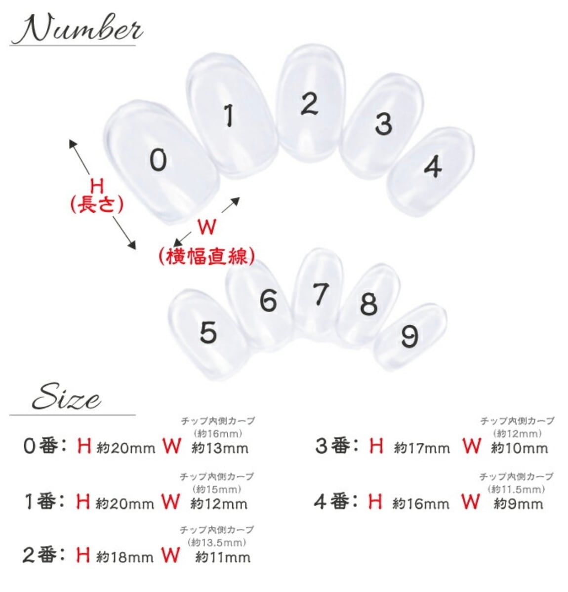 購入希望のお客様は、ネイルチップを購入の前に、計測用のネイルチップの購入をおすすめしております。商品欄に計測用のチップが販売しておりますので、そちらからお好きなチップの形をお選びいただき、ご自身で何番のチップが合うのか確かめていただきたく思います。計測用チップを購入しない場合、チップのサイズがお決まりでしたら、オーダーにて親指から小指まで順番に番号を教えていただく形になります。例を参考によろしくお願いします!