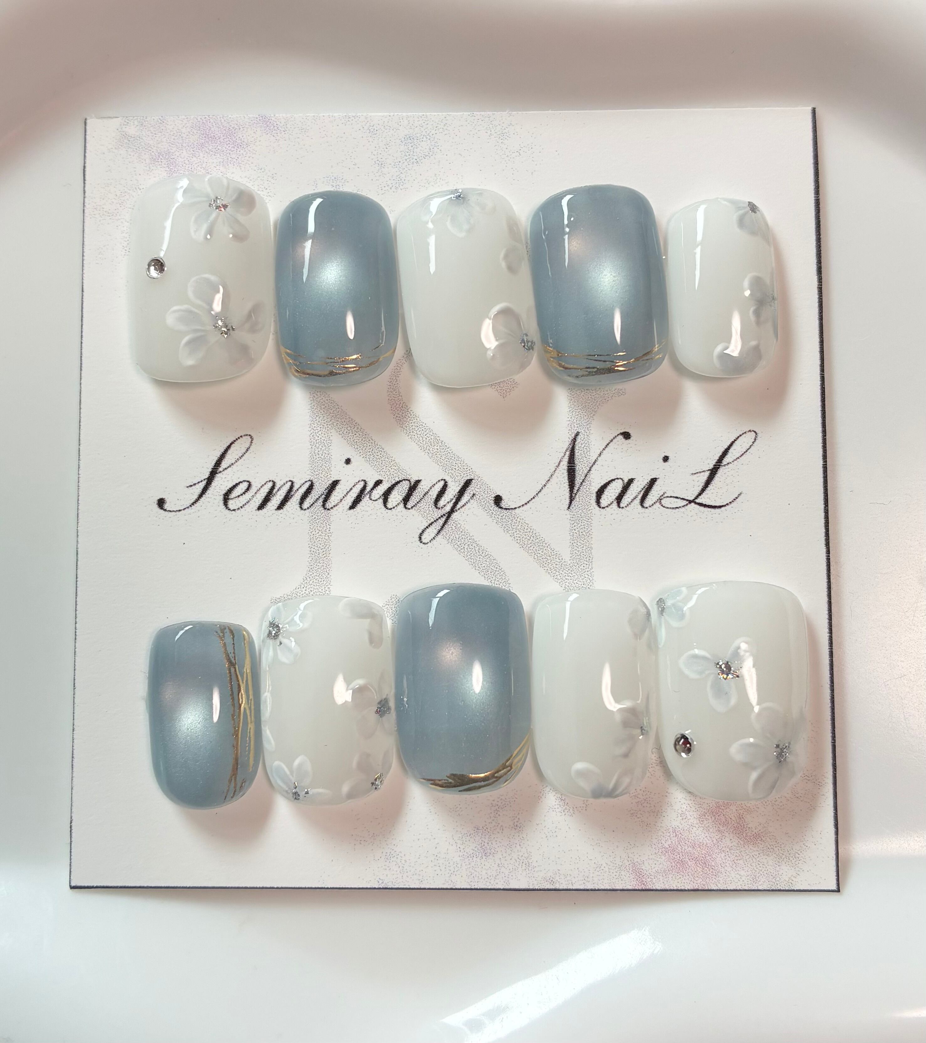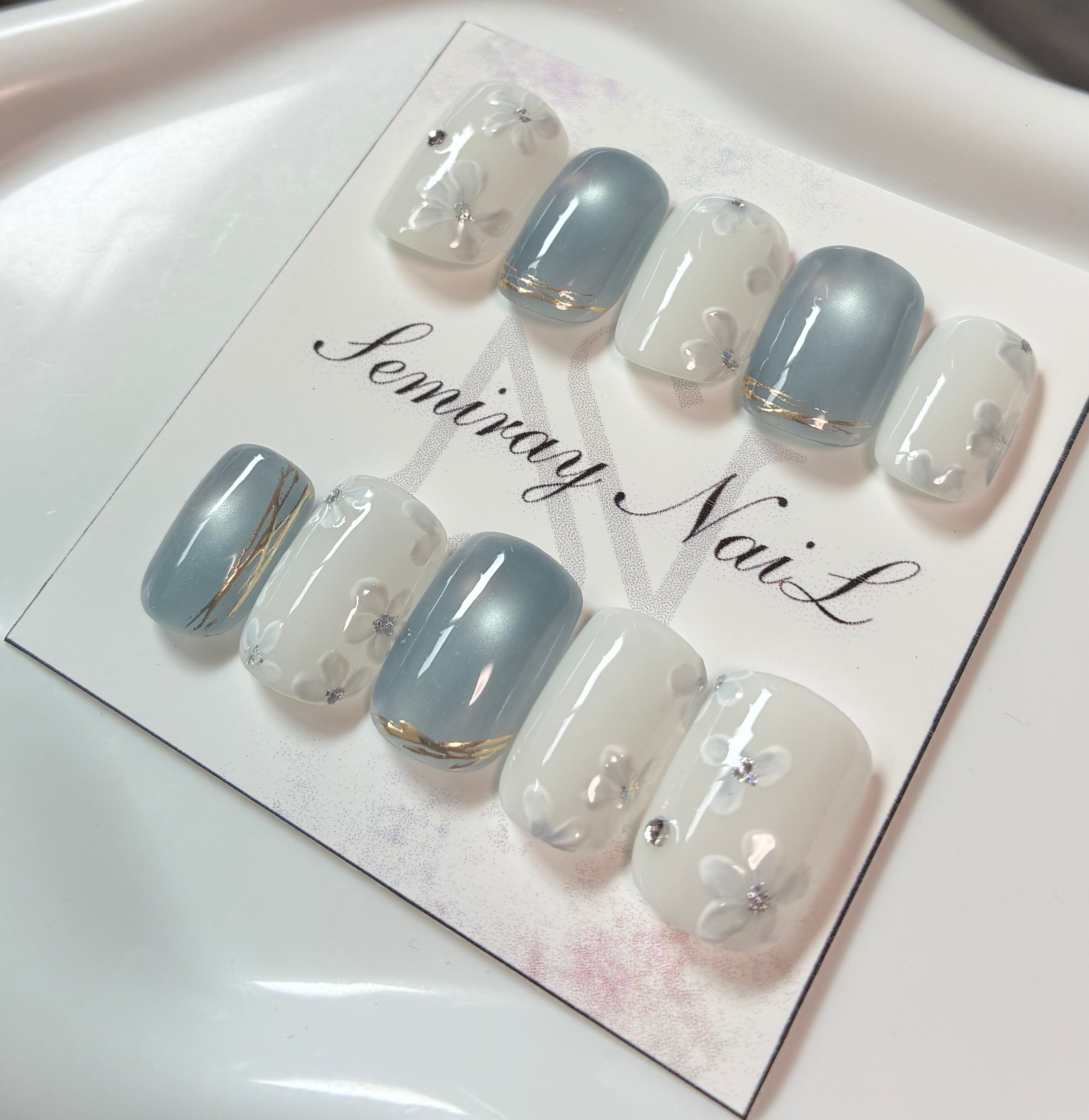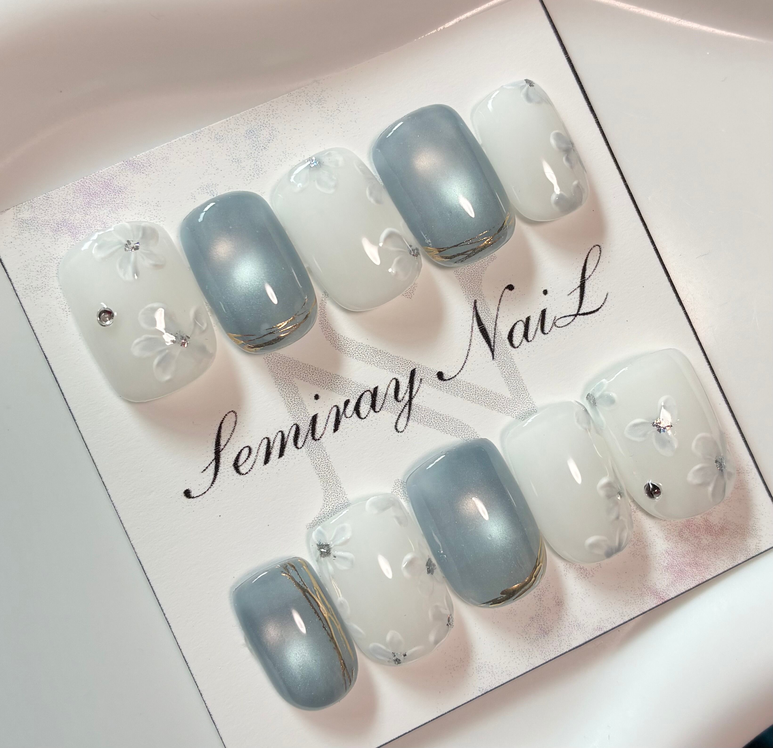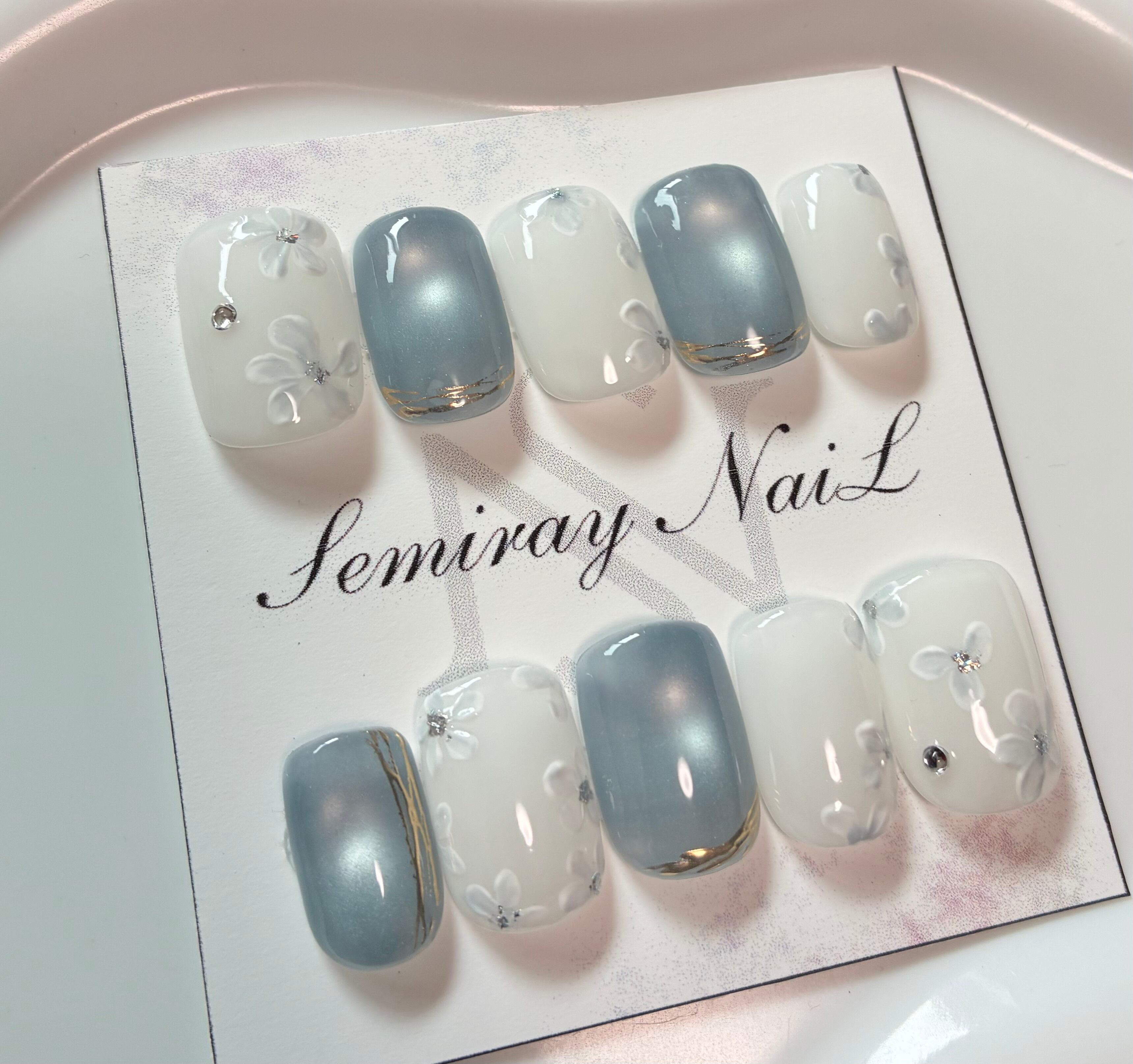 夕暮れの美しいブルーをイメージしたフラワーネイルです。優雅な花のモチーフが施され、指先を華やかに彩ります。この特別なデザインは、あなたの爪にしっかりフィットし、どんなシーンでも魅力を引き立てる一品です。